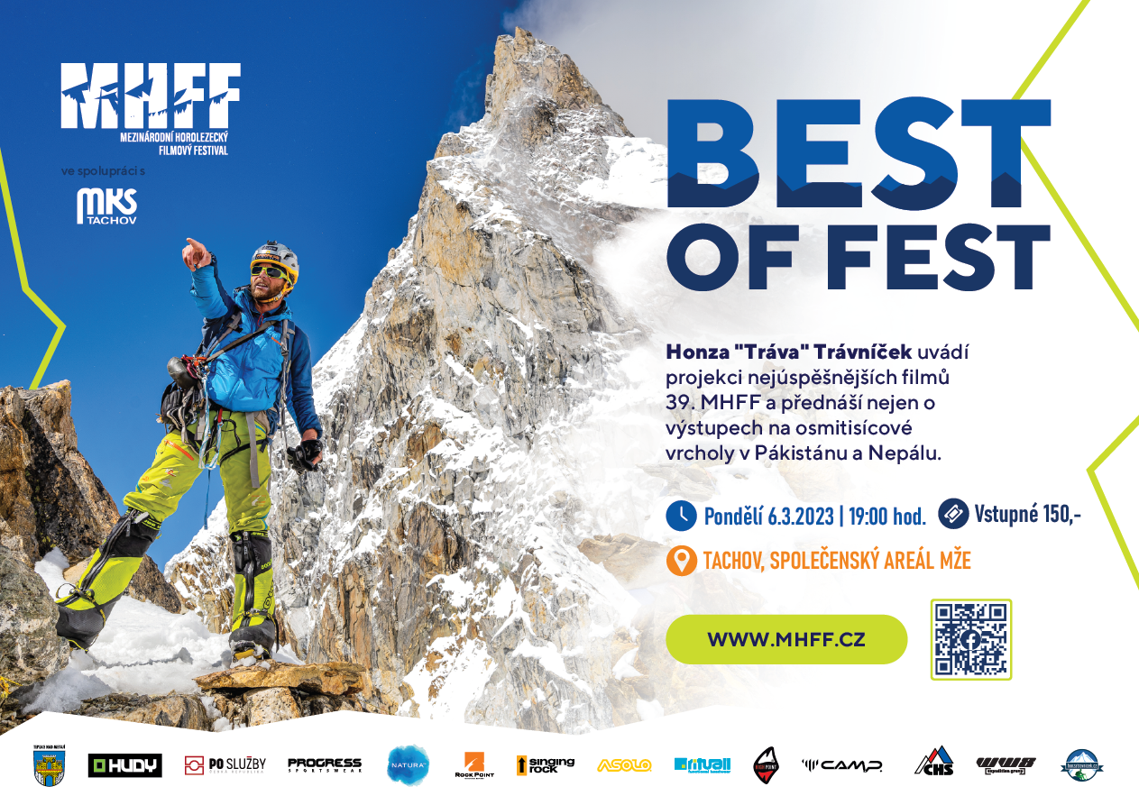 Ambasadorem Best of Fest - MHFF TOUR je jeden z nejúspěšnějších českých himálajských horolezců Honza „Tráva" Trávníček, který každé naše filmové zastavení okoření svou závěrečnou přednáškou.