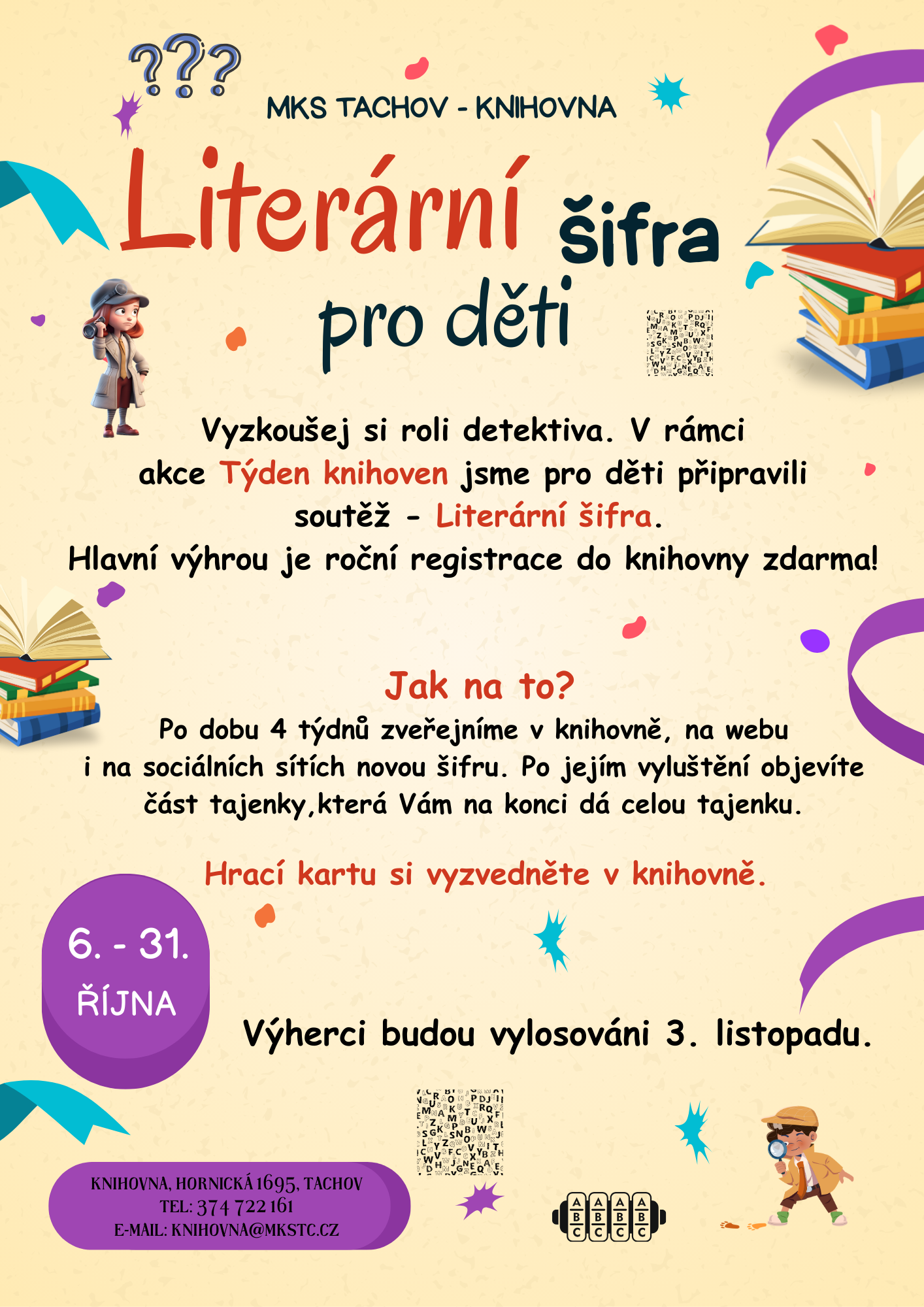 Od 6. do 31. října si mohou děti vyzkoušet roli detektivů. V rámci Týdne knihoven jsme pro ně připravili soutěž - Literární šifra. Každý týden bude v knihovně i na našich sociálních sítích zveřejněna nová šifra, kterou je třeba rozluštit. Tajenku si děti zapíší do hracího listu.