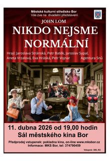 Málokterá komedie tak rozesměje, jako ty od Johna Loma. Po kometě „Šest v tom“ se na diváky řítí další. „Nikdo nejsme normální“ je komediální hit. Vodopád neuvěřitelných situací, kterým se divácká bránice jen těžko ubrání. Roger, Belinda, Frenký, Carmen, Dustin a Gloria jsou zárukami skvěle prožitého večera. A jako třešnička na dortu plném smíchu, zástupce umělé inteligence Kliford. Nikdo z nich není normální…Možná, že ani vy…
