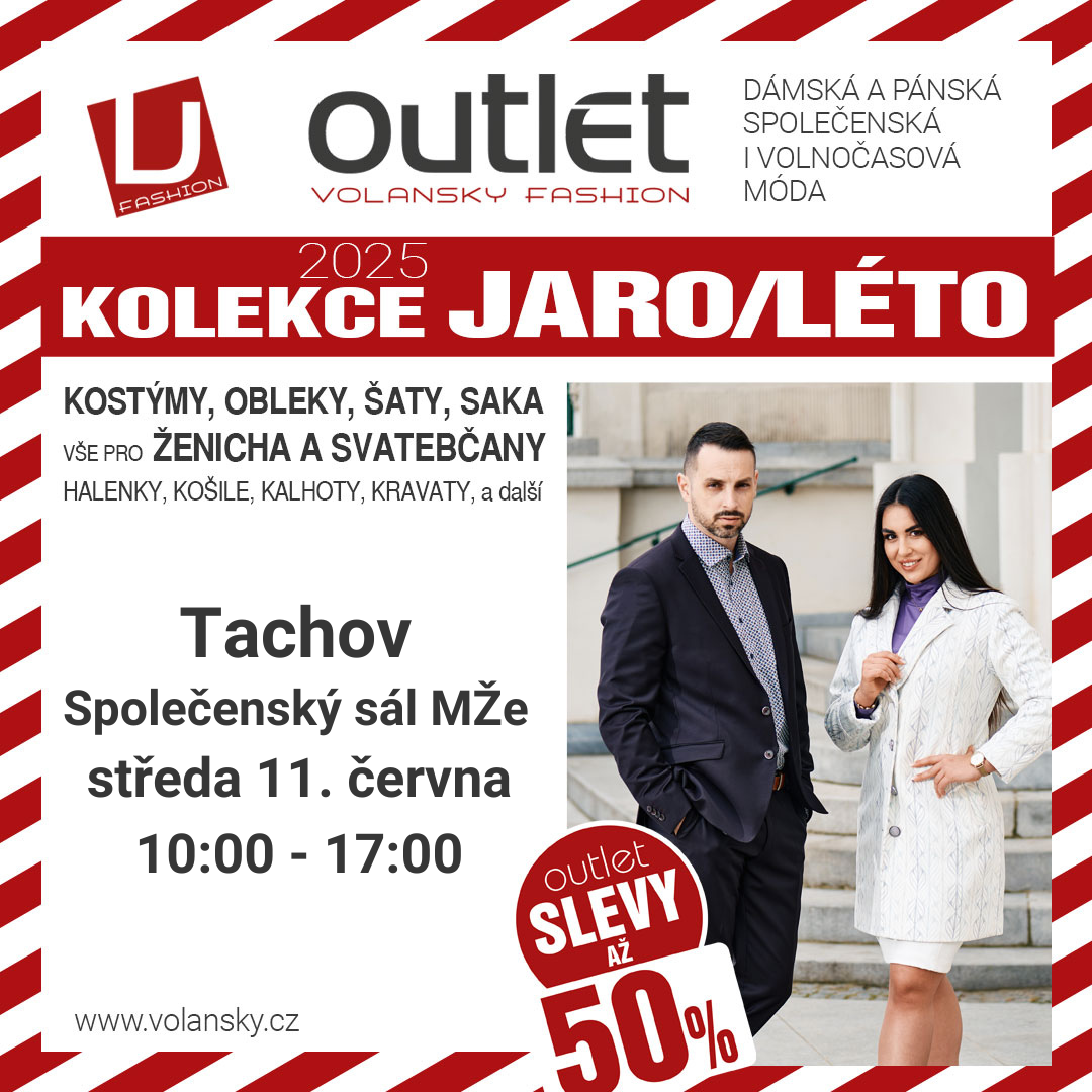 Navštivte jedinečnou prodejní akci v Tachově! Ve výprodeji outlet VOLANSKY FASHION a kolekcí jaro a léto můžete nakoupit se slevou až 50 % módu pro pány i dámy. Pánská i dámská saka, pánské košile, dámské halenky, sukně i šaty mnoho dalšího. Výhodně nakoupíte i pánské obleky a společenskou módu na svatby i ke zkouškám. Vše pohodlně na jednom místě, možné i platby kartou. Nakupte si kvalitní módu za příznivé ceny!