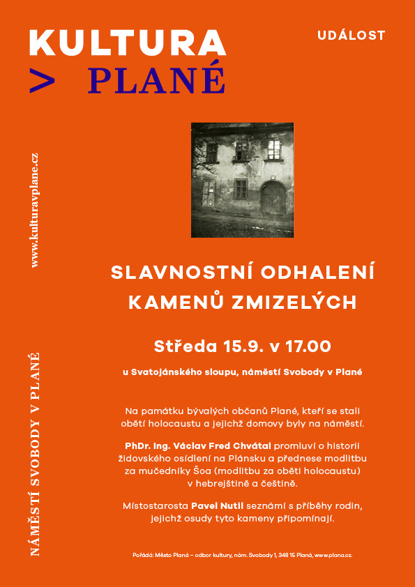 PhDr. Ing. Václav Fred Chvátal promluví o historii židovského osídlení na Plánsku a přednese modlitbu za mučedníky Šoa (modlitbu za oběti holocaustu) v hebrejštině a češtině.