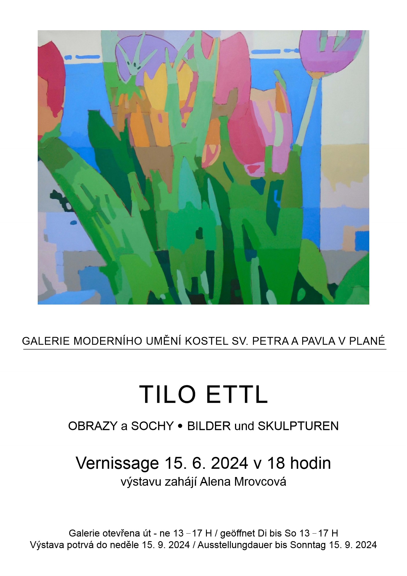 V galerii v kostele sv. Petra a Pavla od 16. června do 15. září vystavuje Tilo Ettl obrazy (akryl na plátně) z roku 2023 a několik i z této sezóny. Letní termín souzní s atmosférou výstavy. Dominantní série zobrazuje různé barevné naladění kytice velkoformátových obrazů. Jedna z dalších sérií se zabývá koloristicky redukovanými akty. Sochařskou tvorbu zastupuje dřevěná mužská figura v životní velikosti.