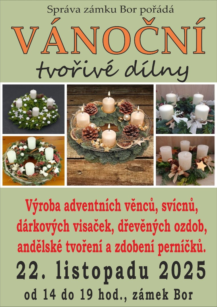 V hodovní síni zámku si můžete přijít vyrobit vánoční dekorace - adventních věnce, svícny, andílky nebo si nazdobit perníčky. K prodeji bude drobné občerstvení - svařák, čaj, deterty aj.